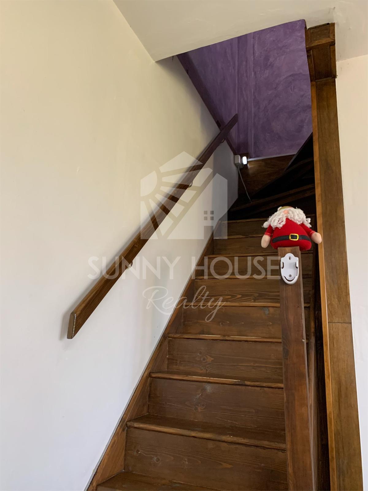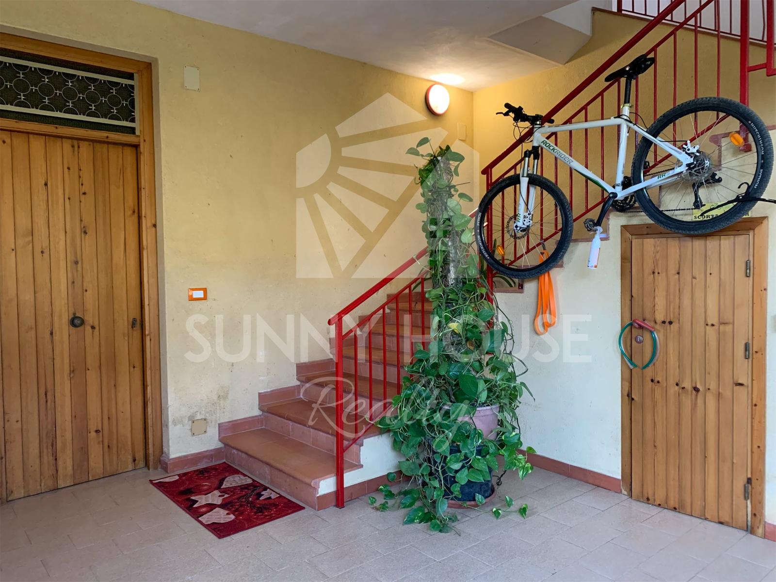 Il portone d’ingresso conduce alla scala che accompagna al primo piano, dove si apre un luminoso soggiorno con cucina a vista e camino, ambiente caldo e accogliente perfetto per la vita quotidiana. Sullo stesso livello si trovano due camere da letto e un bagno.